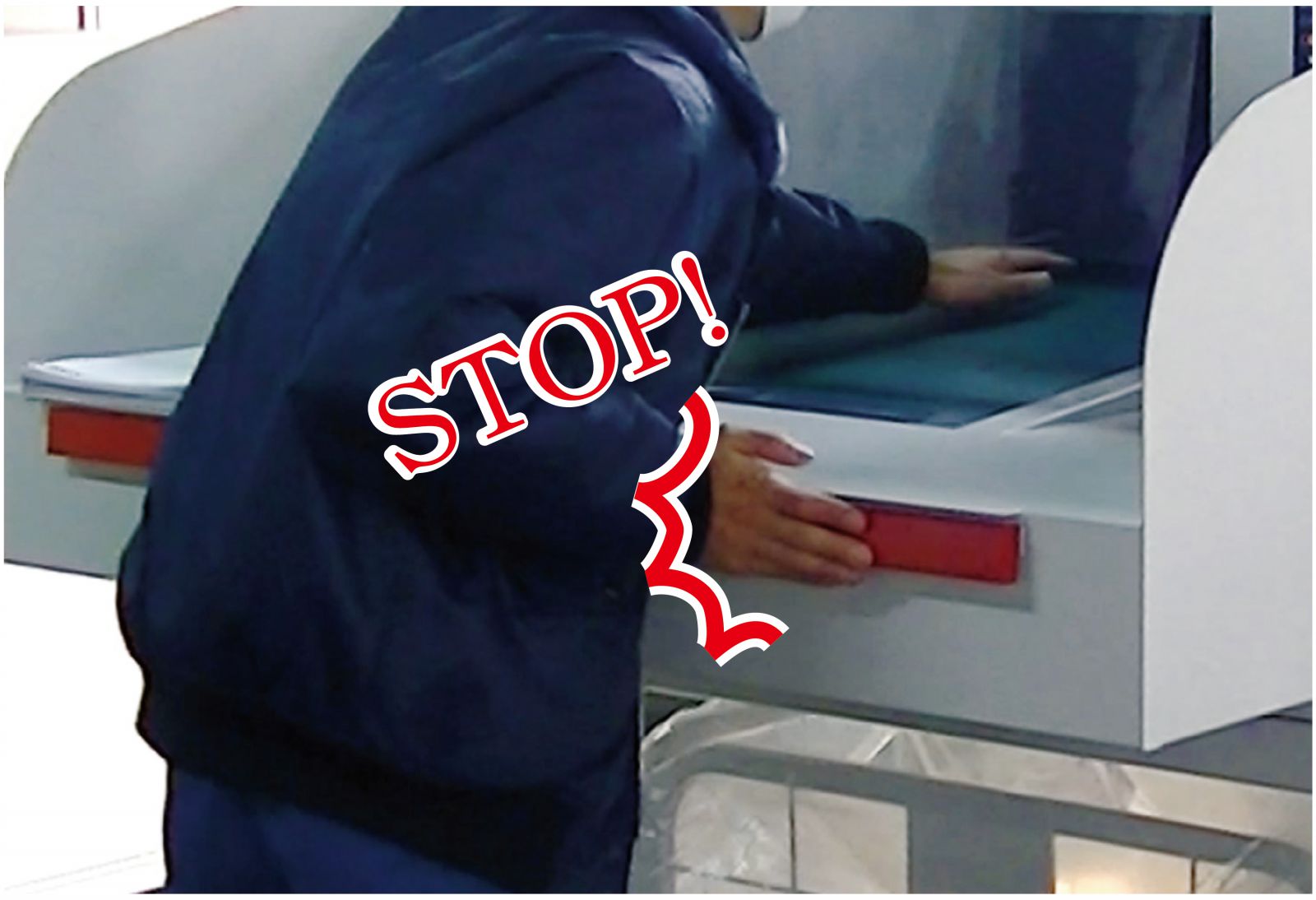 万一の事故回避と安全性をよりいっそう高めるために、独自に設計された非常停止バーをテーブル手前に設けています。また作業者に危険を及ぼす可能性がある可動部の扉などが開いていると作動しません。 |