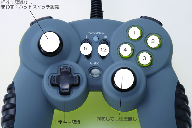 本体に表示のボタン番号やパッケージ背面のボタンの配置図は専用ドライバーをインストールした状態のものです、専用ドライバーを使用せずWindows標準のままでのご使用の場合「十字方向キー」と「1から10までのボタン」など一部の機能が認識されますが(例として)ボタン1はパソコン側では4と認識され、ボタン2は1、ボタン3は3、ボタン4は2へと認識されるなど実際のボタンの順序とは異なって認識されますのでご了承下さい。