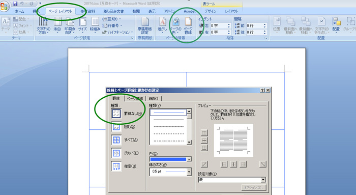 | [罫線]タブで囲み方を種類:罫線なしに設定してください。 |