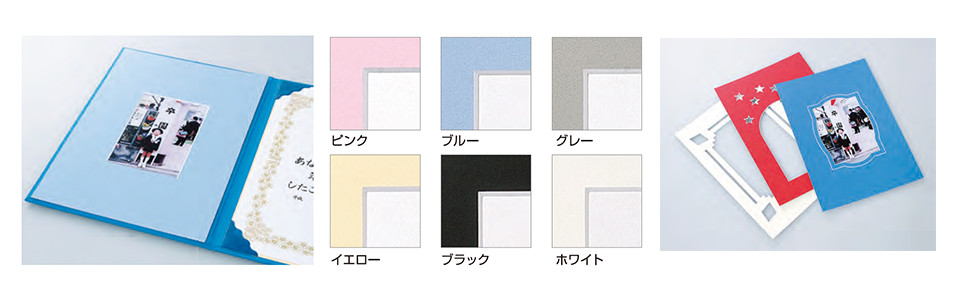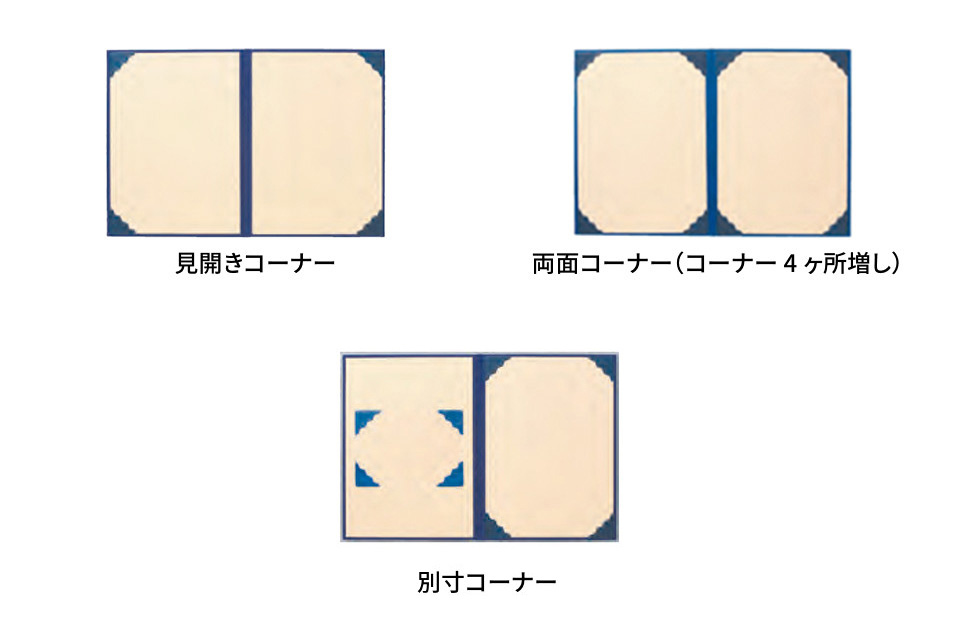 片面に八つ切の画用紙が収納できる切り込みタイプのコーナー付き。【二つ折りタイプ】をラインアップしています。