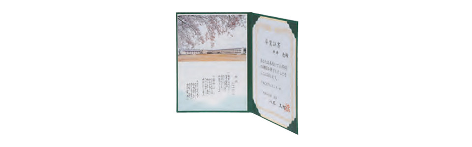 皮絞の型押しをした特殊紙表紙の簡易型証明書ファイル。記念写真を収納できる写真台紙が付属しています。【二つ折りタイプ】をラインアップしています。